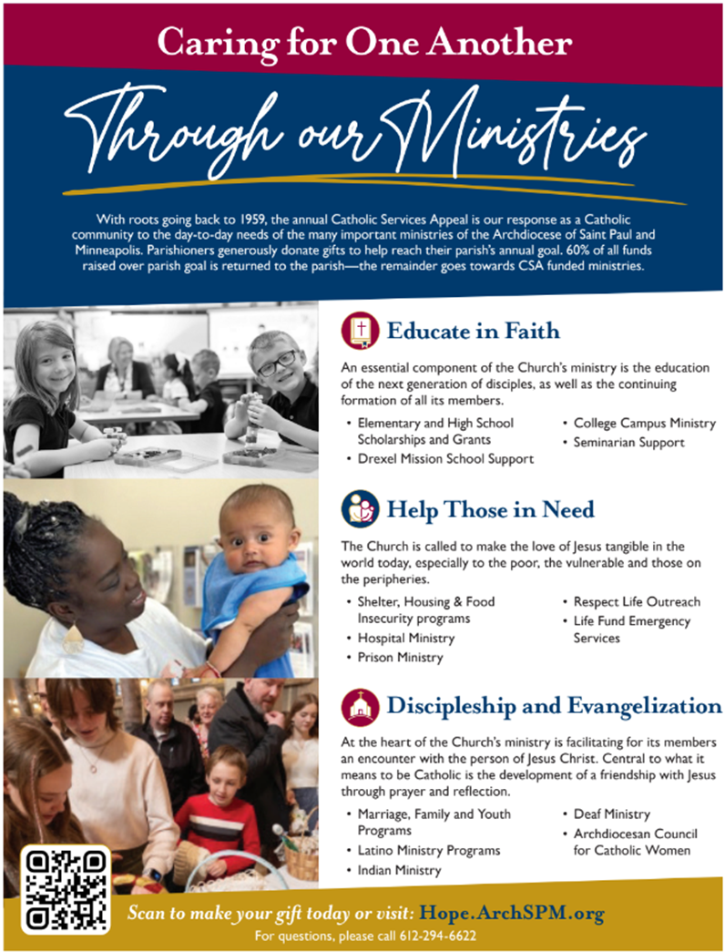 Catholic Services Appeal 2026 in Pew Request this Weekend: As modern-day disciples, there are numerous ways we can serve the Lord and spread his Good News, like supporting our Catholic Services Appeal. Let us prayerfully consider a gift to the Appeal so that the light of Christ continues to shine for those who are in need. As a reminder, 90 cents of contributions benefit ministries and parishes directly, and just 10 cents go to administrative costs, which is below the standard fundraising and operational costs of 12-20%. St. Therese parish also benefits from your donation.